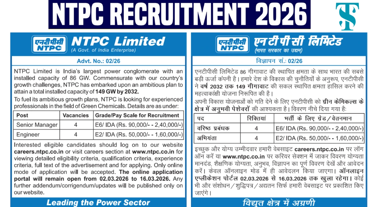NTPC Recruitment 2026: इंजीनियरिंग और अन्य पदों पर भर्ती, ऐसे करें आवेदन, सरकारी नौकरी का बड़ा मौका